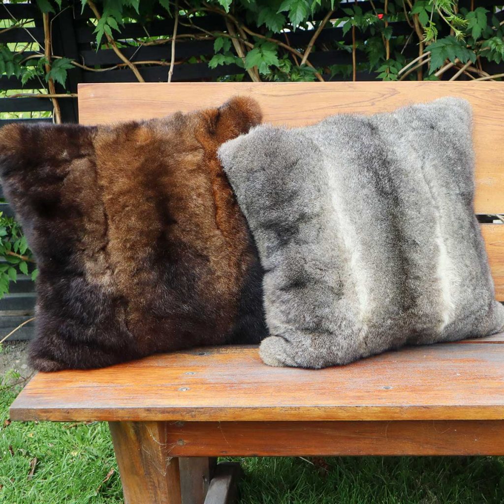 The back of each cushion is 100% wool, while the cushion closures are covered buttons using the same wool as the backing. This wool has a beautiful cashmere finish which beautifully complements the fur. This cushion is envelope style and is constructed with complete tailoring techniques. It is completely lined with industrial weight calico so there are no seams showing inside the cushion.